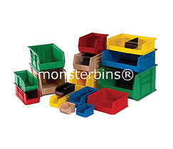 Stackable Plastic Storage Bins from Monster Bins are perfect for all sized parts, from small to large, including: Tools, Hardware, Crafts, Toys, Supplies, Paperwork, Medication, Pet Supplies, Parts in a repair shop, Products to display in retail stores, Office Supplies & More. These Bins can be used multiple ways: Stacked on top of each other, hanging on the wall or from rail systems, or simply placed on a counter or shelving unit. Stacking Bins have optional dividers, windows and/or covers.